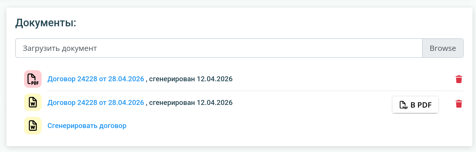 и нажмите Сгенерировать договор. Возможно, придется подождать несколько секунд, затем договор сгенерируется и автоматически скачается. Проверьте результат. Если всё в порядке, можете нажать кнопку "В PDF" и через несколько секунд появится PDF-версия договора.
