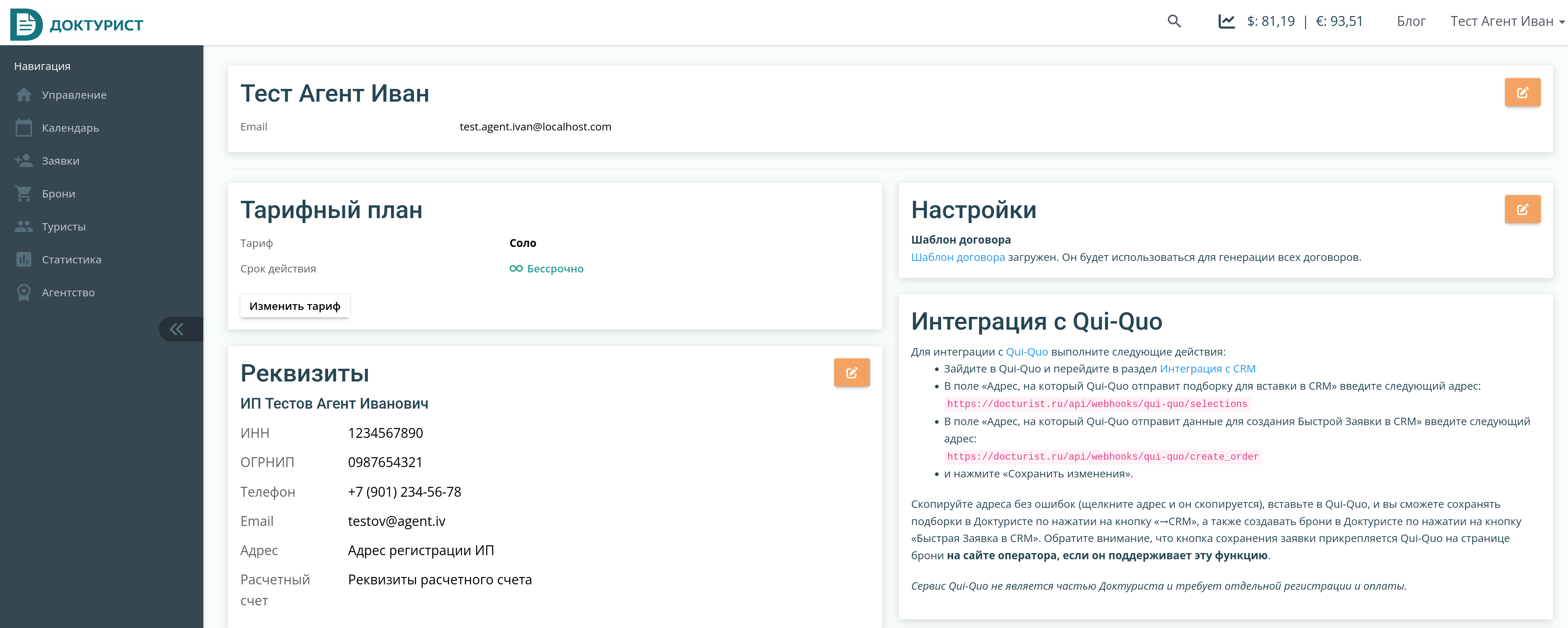 Итак, если мы создадим бронь, то на её странице увидим надпись: Чтобы сгенерировать договор, заполните пожалуйста реквизиты организации в профиле. И это первое, что нужно сделать. Для этого перейдем на страницу своего профиля https://docturist.ru/user (нажмите на своё имя в верхнем-правом углу экрана и выберите "Профиль").